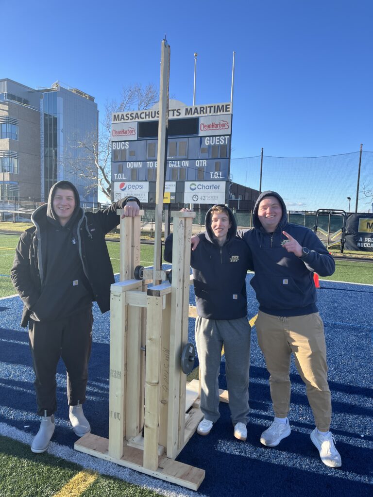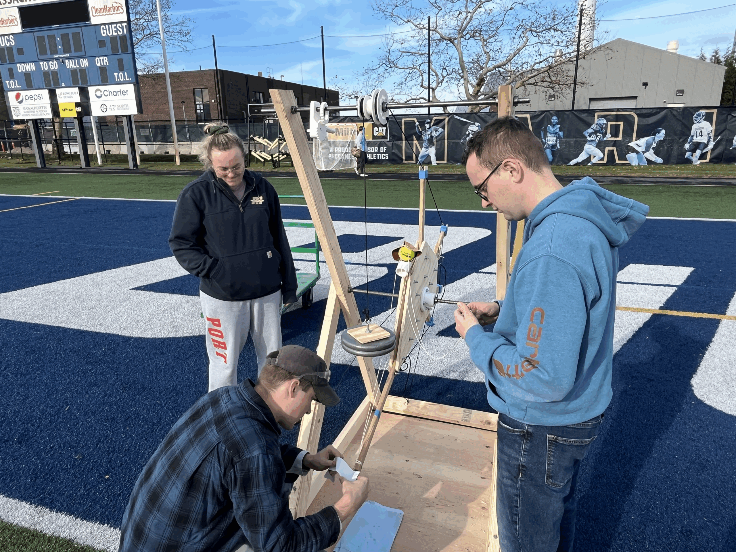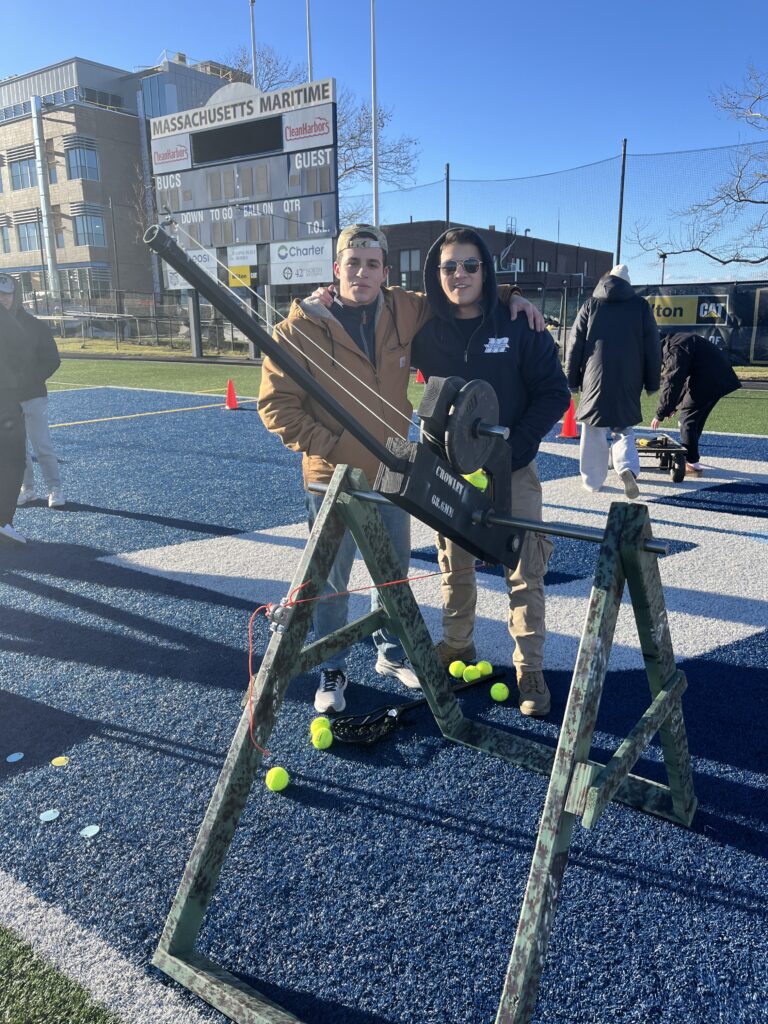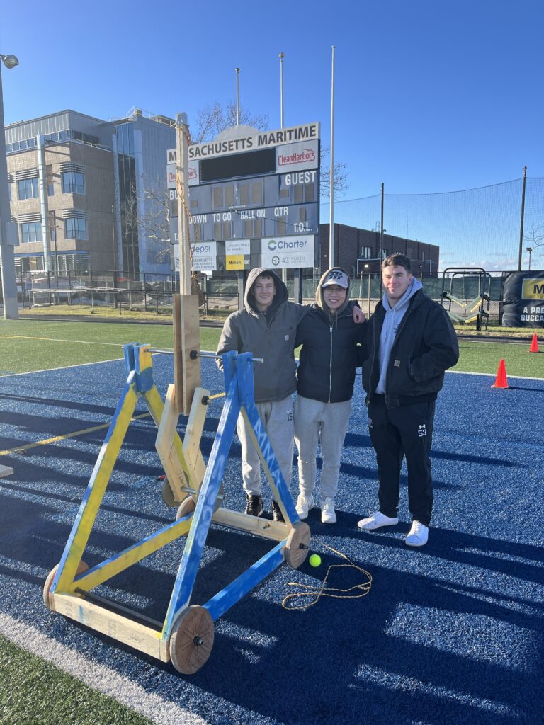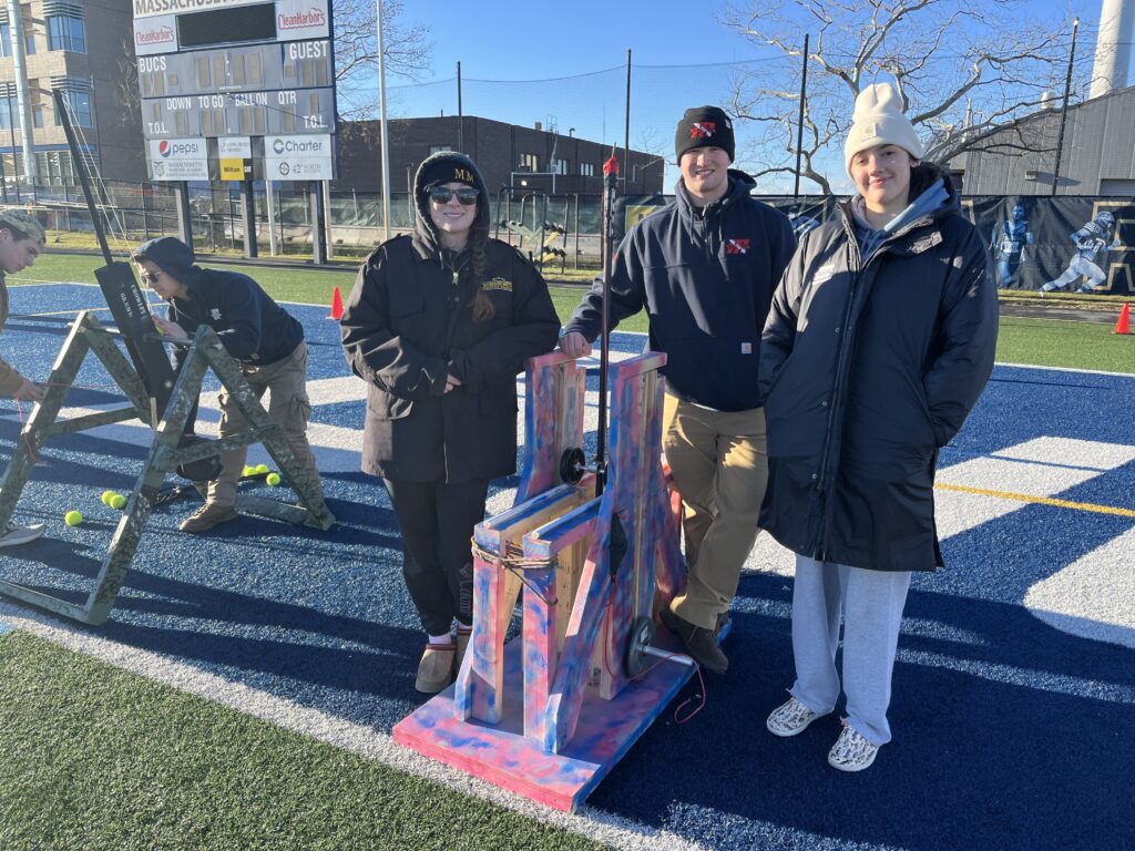 The ESE class of 2027 Introduction to Design cadets conducted a Trebuchet Competition event on December 11. Each of the six teams was provided 20 pounds of weight with a maximum drop height of 3 feet as a potential energy source to throw a tennis ball as far as possible down the field. The teams spent 8 weeks designing, building and testing their Trebuchet design concepts. The competition event had 3 design objectives; longest distance, most consistent distance and fastest firing rate of 5 tennis balls.